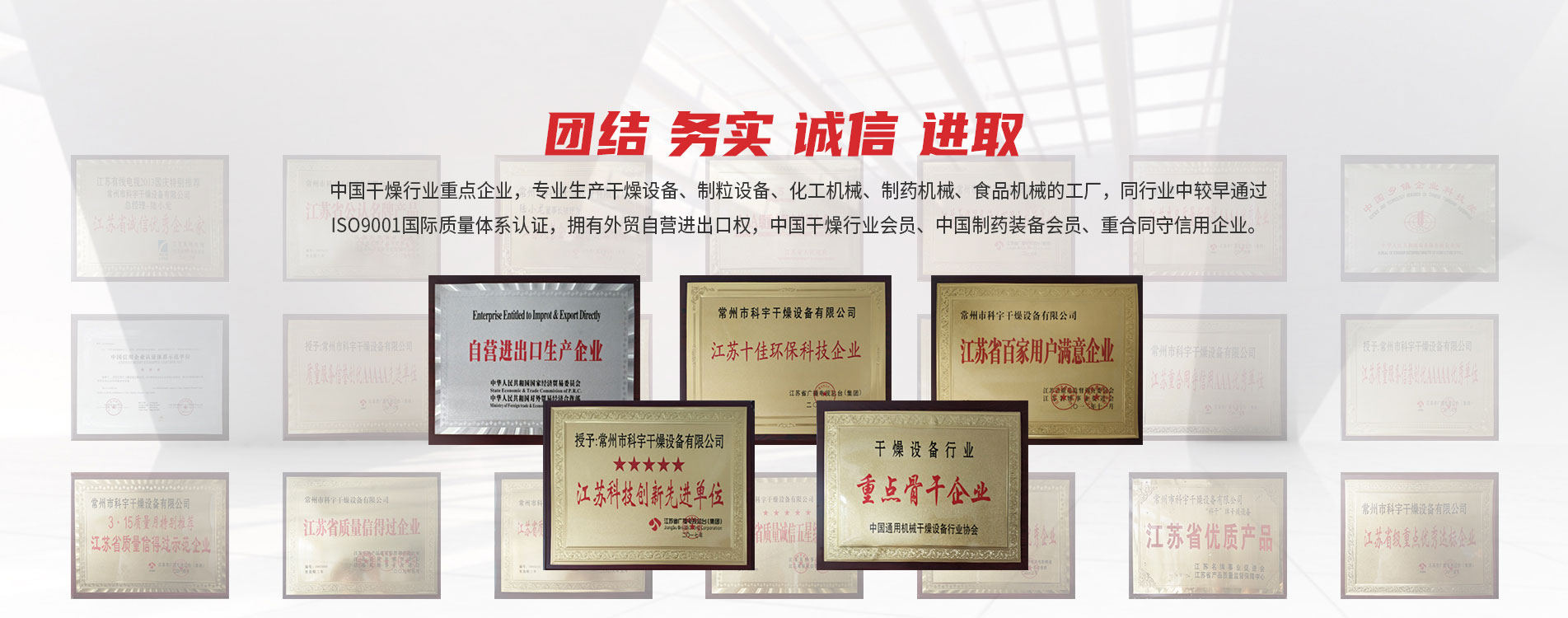 常州市科宇干燥設備有限公司,是中國干燥行業(yè)重點(diǎn)企業(yè),專(zhuān)業(yè)生產(chǎn)干燥設備、制粒設備、化工機械、制藥機械、食品機械的工廠(chǎng),同行業(yè)中較早通過(guò)ISO9001國際質(zhì)量體系認證,擁有外貿自營(yíng)進(jìn)出口權,中國干燥行業(yè)會(huì )員、中國制藥裝備會(huì )員、重合同守信用企業(yè)。